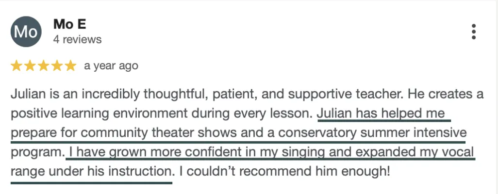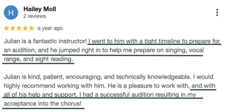 Genre: If you sing it, I can help you. I've worked with performers in musical theatre, pop, classical, contemporary, worship, and everything in between.