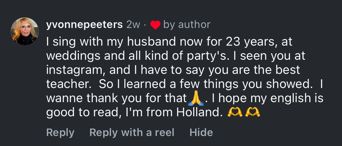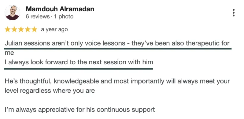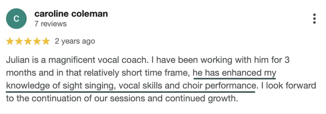 Every session after: We work on vocal exercises tailored to your specific challenges (breath management, register coordination, resonance, whatever you need), I teach you the mechanics behind what we're working on - the actual science, not vague metaphors - and we apply it to repertoire you're actually singing.